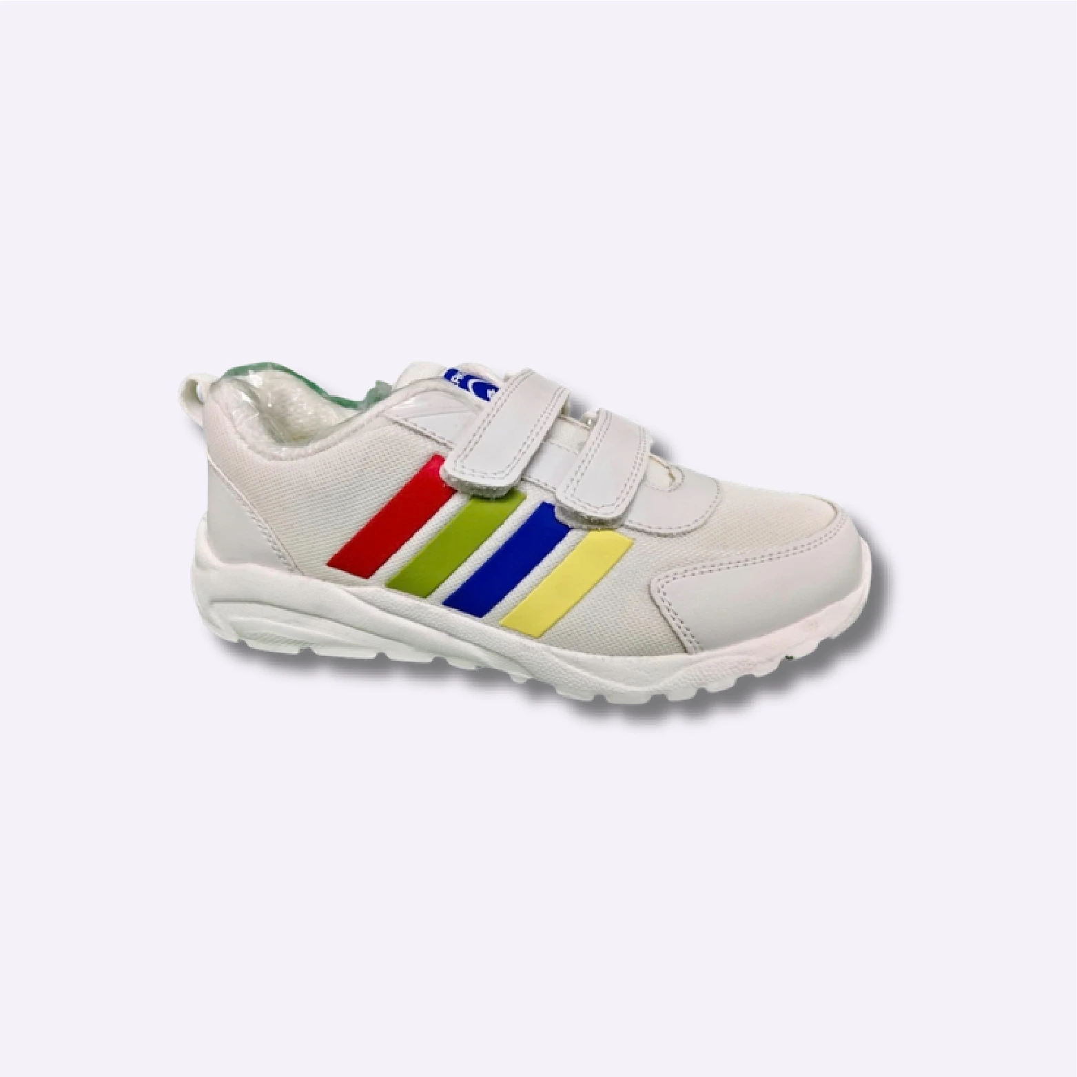 The SRWS White Shoe is a comfortable and stylish kids’ sneaker designed for everyday activities. It features a clean white body with vibrant red, green, blue, and yellow side stripes that add a fun and sporty touch. The double Velcro straps provide a secure fit and make it easy for kids to wear and remove the shoes independently.